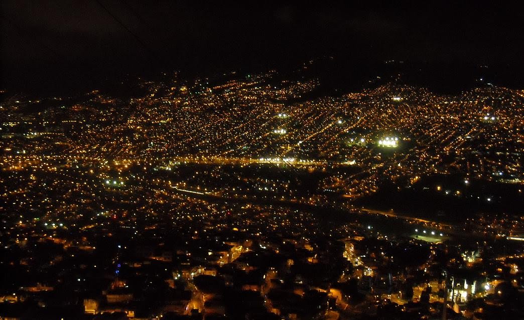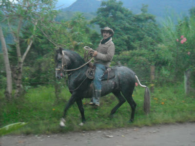La tarde pasó esperando un bus local que llegó lleno de campesinos, niños, abuelas y sacos, sin un hueco para un turista. Me eché a andar sin rumbo fijo, saliendo del pueblo. Un vendedor de esmeraldas me proporcionó un guía de 13 años para visitar bajorrelieves en la garganta del Río Magdalena. Un guía sirve sobre todo para ver el país a través de sus ojos, así que no paré de preguntarle cosas mientras andábamos por barro hacia un paisaje espectacular de laderas cubiertas de cascadas. Volví al atardecer de cielo despejado, custodiado por los perros del barrio y algún carromato.