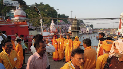 - Y sobre todo observar la ciudad, los dos fascinantes fenomenos de peregrinaje, el yogui y el hinduista, que apenas se mezclan. El yogui occidental es muy conocido, menos lo es el turismo religioso indio, grupos recien salidos de su localidad, compactos y bien diferenciados que me atraian poderosamente por ese punto autentico y a veces inocente de la gente de campo. Mi grupo favorito el de hombres bigotudos y mujeres tatuadas vistiendo ese corset violeta con la espalda desnuda.