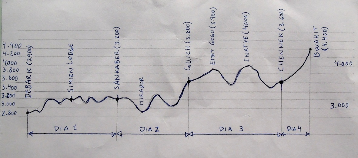 Necesitaréis un día previo para llegar y por la tarde organizarlo todo. Los precios por agencia eran muy variables dependiendo del transporte, pero rondan los 300 euros por persona todo. Nosotros lo organizamos por nuestra cuenta (4 personas) y nos salió por unos 100 euros. Lo más caro es el transporte dentro del parque (30 euros por persona ir de Chennek a Debark). Ir solo incrementa también mucho los gastos. Desde Chennek se puede continuar hasta el Ras Dashen, el pico más alto de Etiopía.