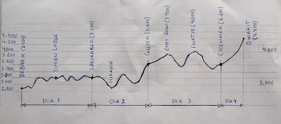 Ninguna, aquí no se hace alta montaña, sino senderismo de alta cota, el único material necesario es abrigo (por la noche llega a cero grados) y buenas botas. El camino es claro y sencillo, y el scout lo conoce muy bien, sólo hay que seguirle. Las jornadas suelen ser entre 6 y 8 horas de marcha con paradas. No sé el desnivel acumulado exacto, pero alrededor de unos mil metros cada día (se sube y se baja constantemente). El desafío real es el mal de altura.